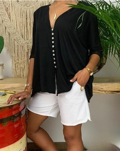 Aida - Moda Botón Encaje Manga 3/4 Cuello en V Camisas Tops